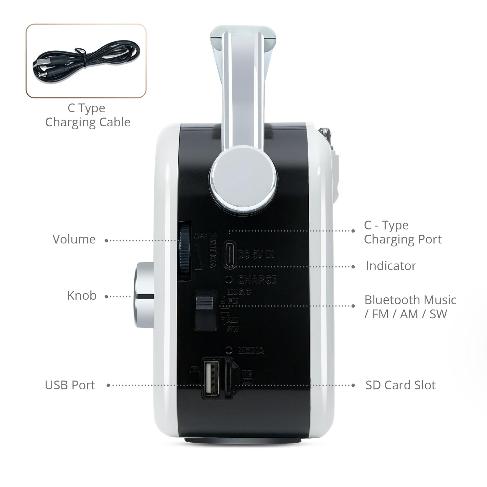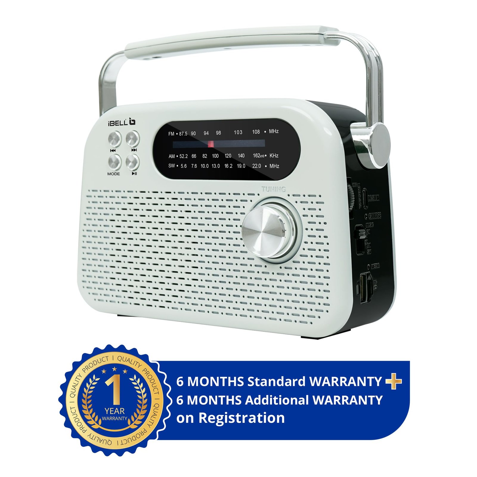 Details: The iBELL FM730BT Portable FM Radio is a compact and versatile audio device designed for everyday listening. It features built-in Bluetooth connectivity that allows you to wirelessly stream music from your smartphone or other compatible devices. In addition to wireless playback, it supports USB and SD card inputs, enabling you to enjoy your favorite MP3 songs without the need for an external device. The radio comes with a headphone jack for private listening and a dynamic speaker that delivers clear and balanced sound. With 3-band radio support, the FM730BT offers reliable tuning and stable reception across different frequencies. Its rechargeable battery ensures convenient use at home or on the go, while the modern Type-C charging port provides faster and more efficient charging. Finished in a clean white color, this portable radio combines classic radio functionality with modern digital features, making it suitable for travel, daily use, and entertainment anywhere.