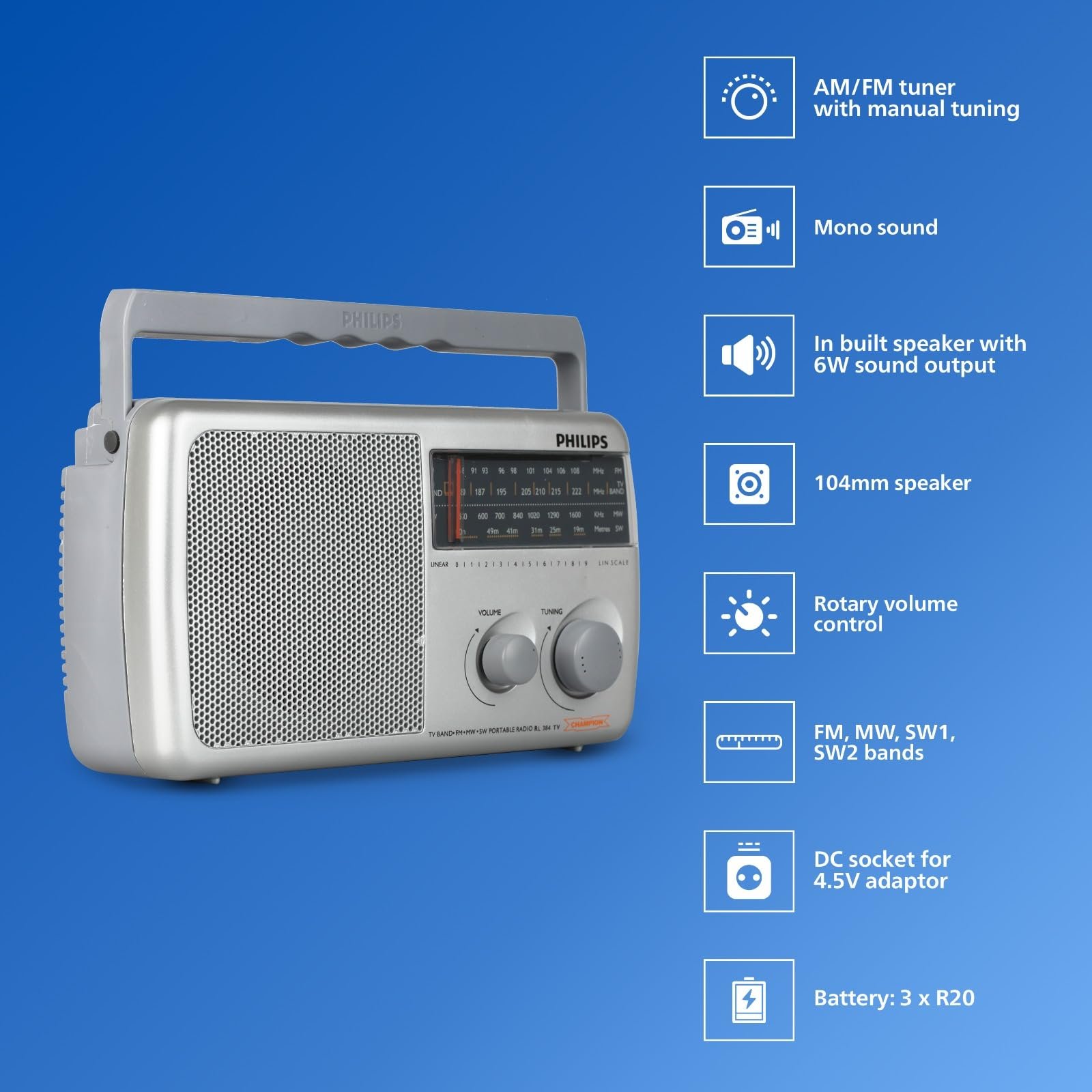 Details: Experience unparalleled audio quality with the Philips Radio that offers crystal-clear reception across multiple bands including FM, AM, SW . Whether you’re enjoying your favourite FM radio for home with speaker, tuning into an FM radio pocket on the go, or exploring international shortwave broadcasts, this radio Philips new model guarantees consistent and high-quality sound. The telescopic aerial ensures enhanced signal reception for clearer listening, while the powerful 4-inch loudspeaker delivers rich, immersive audio for any setting. Powered by three R20 batteries or an external DC source, this radio FM is perfect for both home use and portability. With its compact design, it fits easily in any space, making it ideal as a radio for home old model upgrade or a FM radio for home essential. Whether you’re using it for casual listening, radio FM, or enjoying the convenience of a tape recorder, this versatile device ensures that you never miss your favorite broadcasts wherever you are.