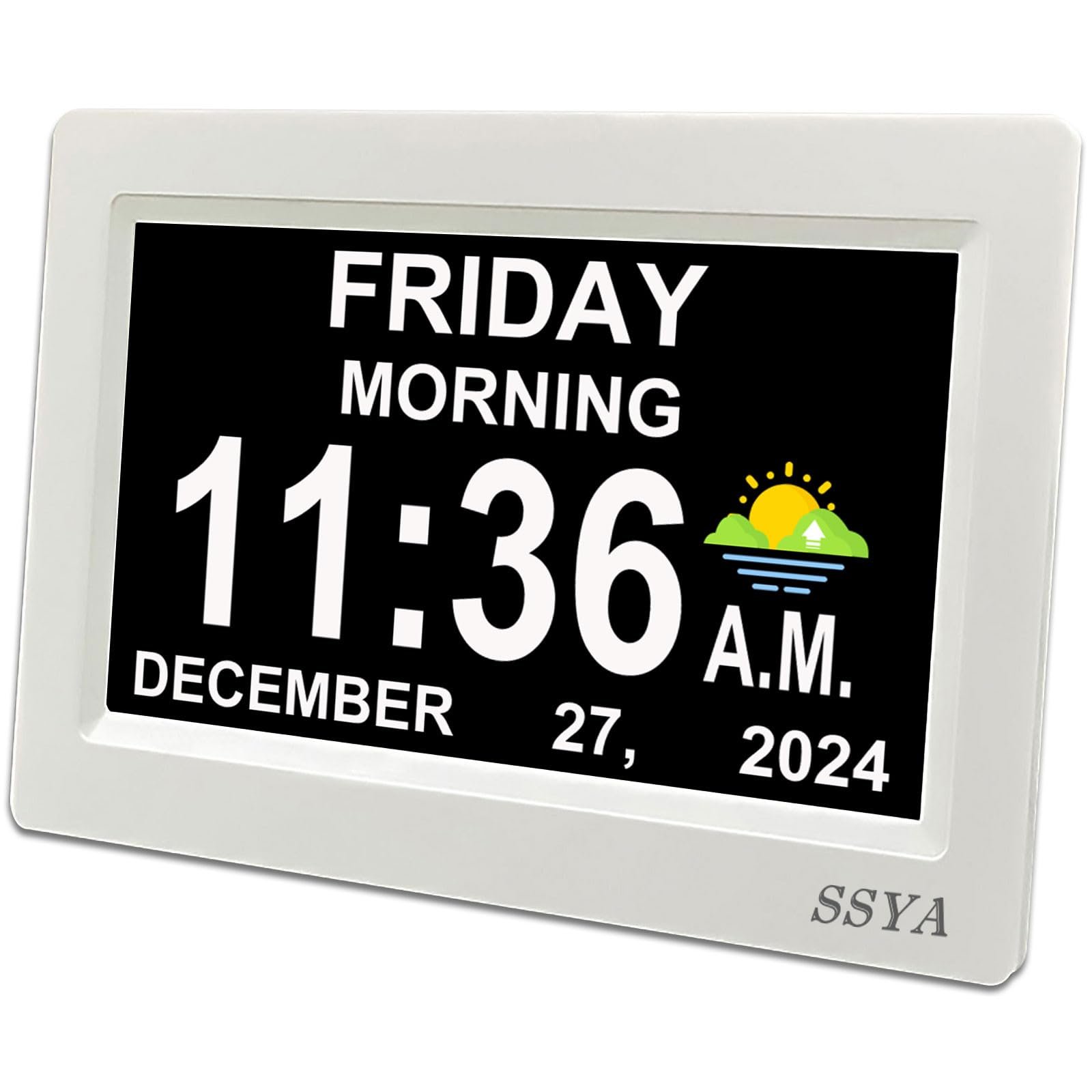 Details: The clearest, easiest-to-read day clock available. The Calendar Clock is a state-of-the-art clock featuring a large, clear display that can be hung on a wall , or stood on a table, nightstand, shelf or desk . It’s great for the home, office, lab and classroom, and especially for seniors and those who benefit from seeing the time and date spelled out and free from abbreviations. Incredibly easy to set up and use. Give the gift of confidence and happiness – buy an CLOCK for your loved ones today! Unmatched Visibility & Contrast Extra-large, crystal-clear white digits shine bright and sharp against our clock’s deep-black display. This delivers unmatched contrast and clarity for remarkable visibility . Made with Memory Loss in Mind Advancing age, dementia, stroke, and Alzheimer’s leave millions of Americans to struggle with memory loss and difficulty processing abbreviated words. To make life easier, our clock features non-abbreviated weekday, month and date names. Best-in-Class Viewing Angle The clock’s high-quality display features a glare-free finish so you enjoy the most exceptional legibility from very viewing angle. This is particularly attractive for office and classroom use, where clocks are often positioned higher up the wall Alarm OptionsPackage includes:1 x 7 inch day Clock1x an A/C adapter(US plut)1x manual